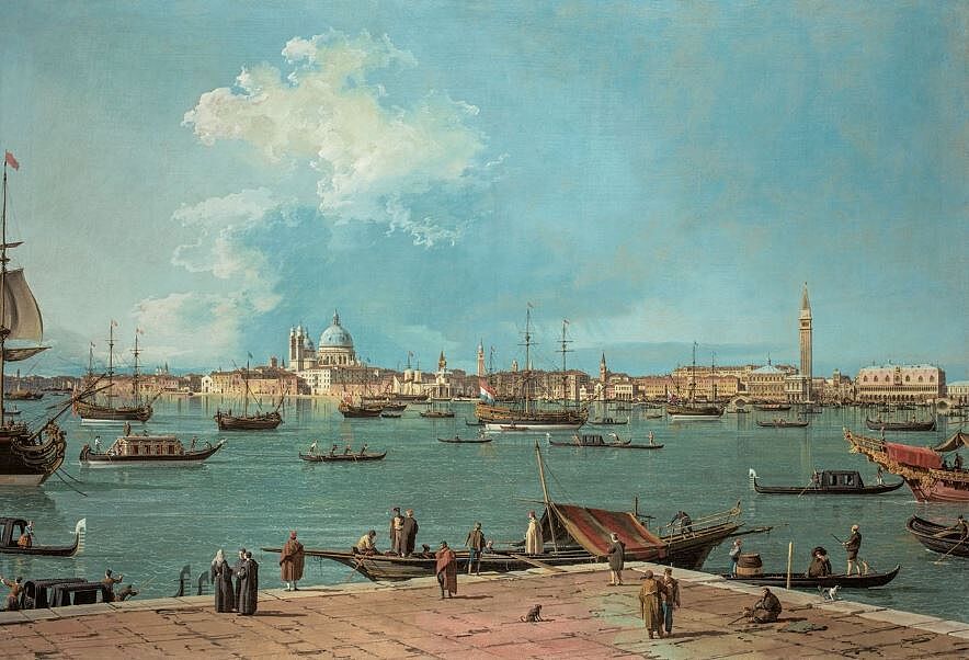 Canaletto feierte Venedig in seinen Veduten als kulturelles und urbnistisches Meisterwerk. Auf der Höhe seines Ruhms inszenierte er die Lagunenstadt als ihr erster Vedutenmaler: topographisch exakte Szenerie, malerische Staffage und eine strahlende, rokokohaft gefärbte Helligkeit verbinden sich zu jenem Bild der Stadt, das die Kunstliebhaber vom 18. Jahrhundert bis heute so sehr schätzen. Die reizvolle Panoramawirkung und topographische Exaktheit erzielte Canaletto durch Verwendung der Camera Obscura. Das so gewonnene Kompositionsgerüst malte er dann detailliert aus, ergänzte pittoreske Szenen aus dem Volksleben und tauchte die Stadt in strahlendes Mittagslicht.