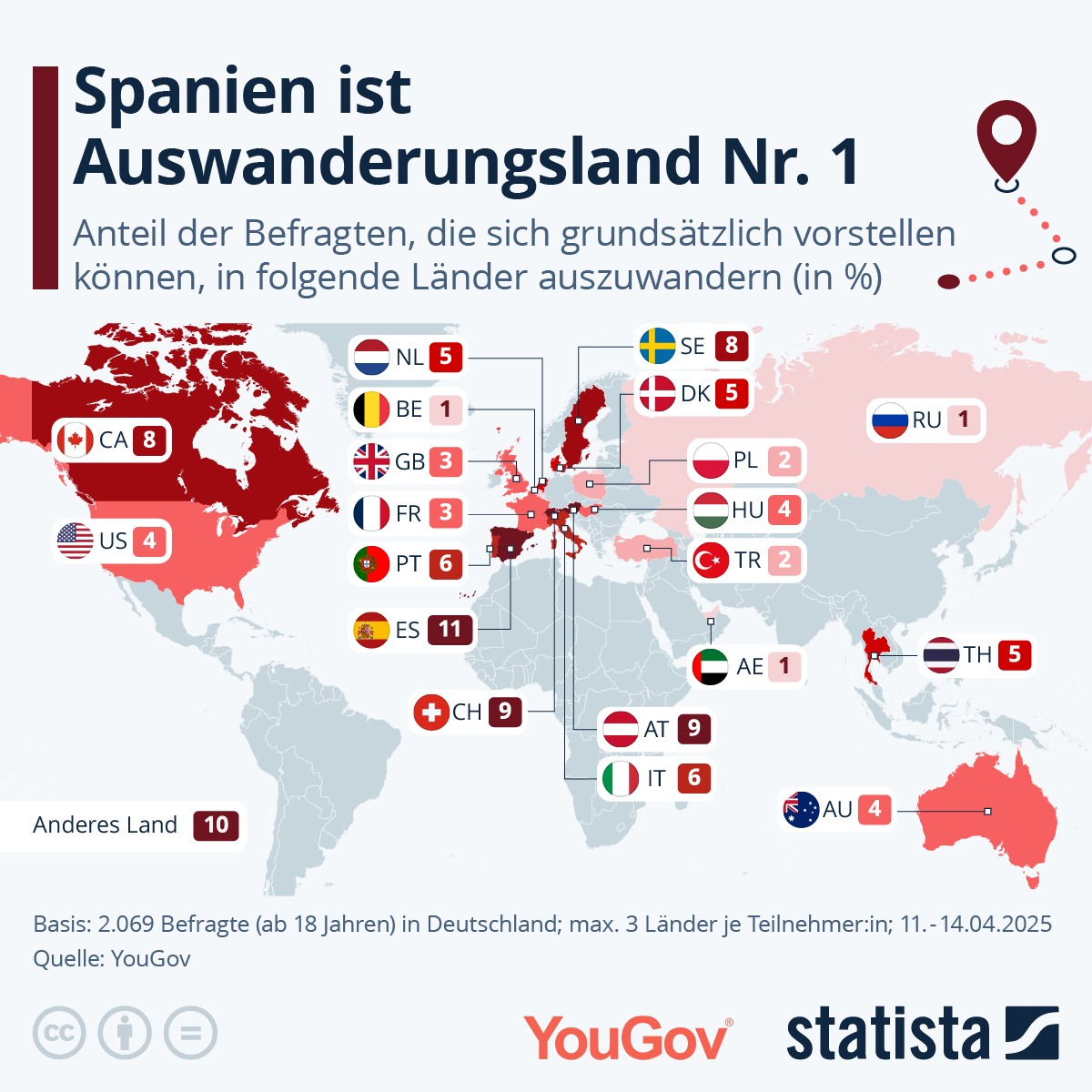 Sie Infografik: https://de.statista.com/infografik/34370/umfrage-zu-den-bevorzugten-auswanderungslaendern-der-deutschen/
