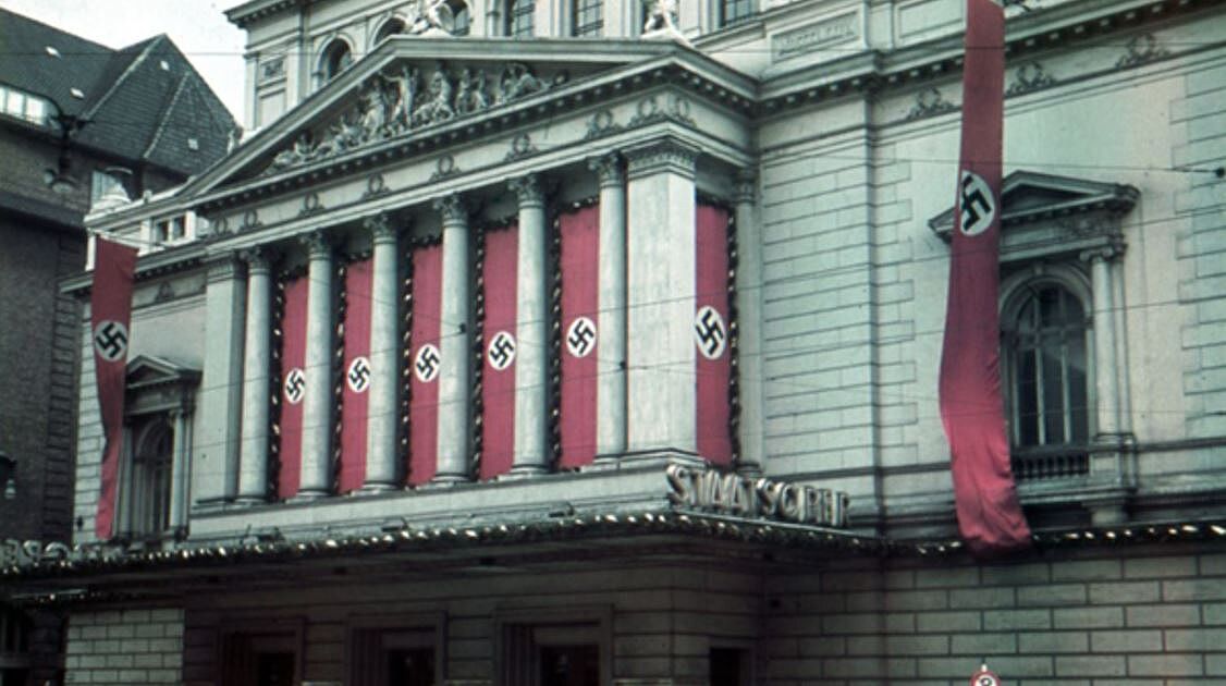 Foto: unbekannt, Sammlung Ralf Klee, Die Hamburgische Staatsoper an der Dammtorstraße, ca. 1937. Das mit Hakenkreuzfahnen beflaggte Vorderhaus wurde 1943 bei einem Luftangriff zerstört und 1955 durch einen Neubau ersetzt.
