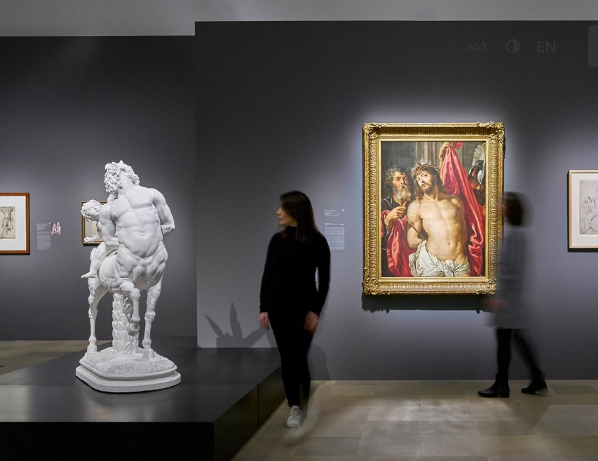 Auf dem nach Bildmotiven und Themen strukturierten Rundgang treffen die Besucher auf altbekannte mythologische Sujets wie Venus und Adonis, das Parisurteil oder den an den Felsen geschmiedeten Prometheus, aber auch auf zentrale Themen des Alten oder Neuen Testaments wie die Enthauptung des Holofernes oder die Grablegung Christi. Beispielhaft verdeutlicht wird Rubens’ kreativer Arbeitsprozess gleich im ersten Ausstellungsraum anhand seiner Darstellung Christi als Ecce homo (um 1612): Mittels dreier Exponate wird die metamorphotische Verwandlung der antiken Skulptur eines Kentauren zu dem einer Zuschauermenge vorgeführten Christus veranschaulicht. Von der antiken Skulptur fertigte Rubens zunächst mehrere Zeichnungen an, die er anschließend in dem Gemälde weiterentwickelte: In einer vollständigen ikonografischen Neubestimmung verwandelte er das antike Vorbild des ungezügelten, animalischen Kentauren in eine Darstellung des leidenden, vom Betrachter Empathie und Mitgefühl einfordernden Christus. Mit Rückgriff auf die Antike wird der Leib Christi so auf überraschende Weise inszeniert und mit seinem athletisch gebildeten Oberkörper regelrecht zur Schau gestellt.
