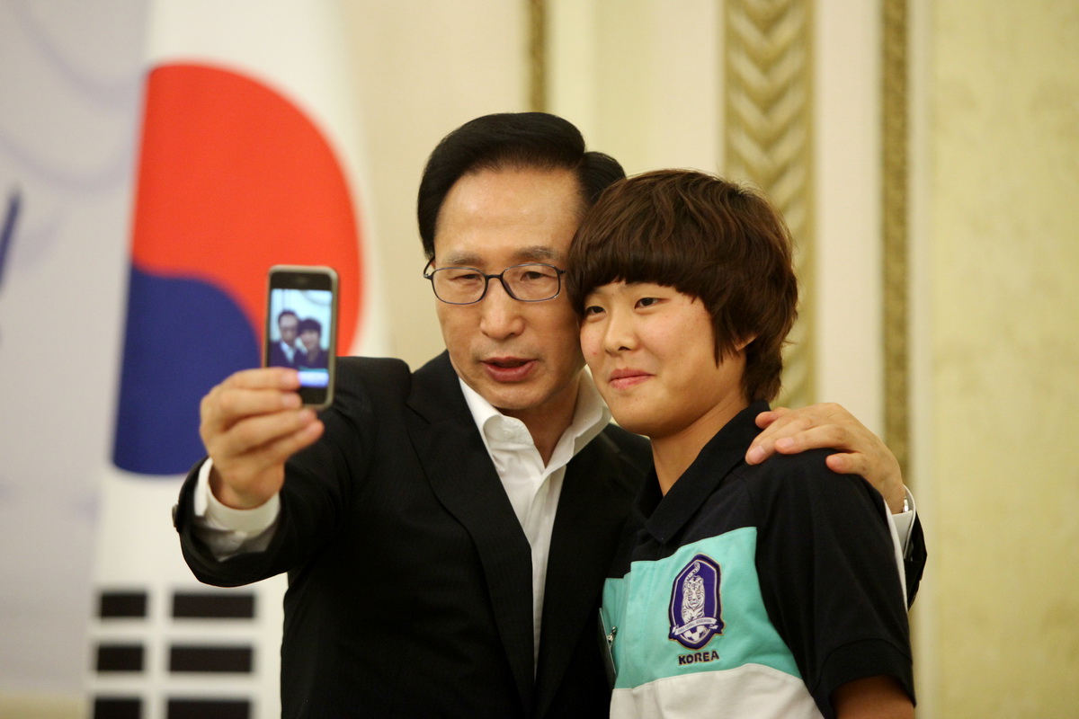 Foto: Aufnahme eines Selfies (der ehemalige Präsident Südkoreas Lee Myung-bak mit der Fußballspielerin Ji So-yun), Korea.net / Korean Culture and Information Service, CC BY-SA 2.0